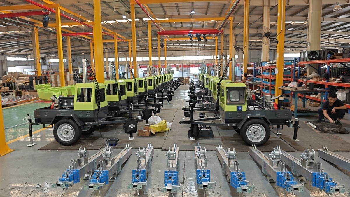 某國外客戶經(jīng)過考察對(duì)比,先購買我廠3臺(tái)移動(dòng)照明車進(jìn)行試用,試用效果十分滿意,經(jīng)過評(píng)估又繼續(xù)追加27臺(tái),以下為生產(chǎn)裝配現(xiàn)場